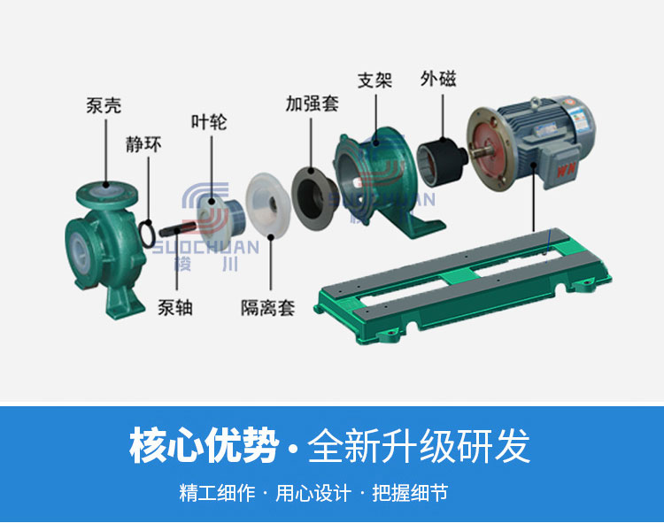 用途 本產品廣泛適用于:石油化工、制酸制堿有色金屬冾煉、汽車制造的酸洗工藝、稀土分離、農藥、染料、醫藥、造紙、電鍍、無線電等行業。適用溫度:-20℃C~100℃。 設計特點 防漏設計取消了軸封,利用磁力耦合間接驅動,完全消除了滴漏的煩惱,絕不污染場地。由于泵的過流部分選用“氟塑料合金”制造??蛇B續輸送任意濃度的酸、堿、強氧化劑等腐蝕介質而毫不受損。 工作原理 驅動裝置采用主動磁性聯軸器直接裝在電機軸上,泵腔完全封閉,通過磁力耦合間接驅動泵軸上帶磁鋼的葉輪旋轉,結構緊湊、安全節能。 堅固耐用的泵體 結構雖然接觸液體部分是氟塑料,但泵體基體是金屬材料,故泵體可以承受部分管道的重量及機械性沖擊,堅固耐用。
